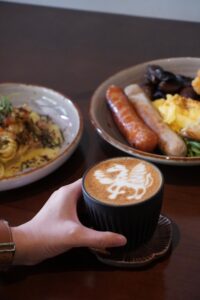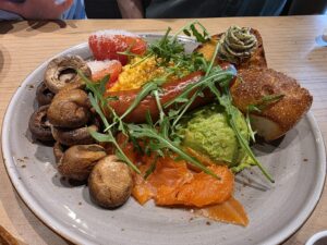 March 18, 2026 at 4:20 pmCoffee was meh, cake was meh. Mushrooms, scrambled eggs, sausages, mashed avo, smoked salmon were great. Fish and chips did not scratch the itch. Service was alright, ambience was alright. Overall pricey for the food and service offered. Unfortunately won’t be back.