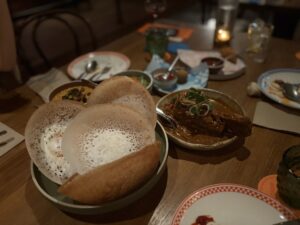 I had the Jaffna Duck Curry, Kaju Curry, Malu Baduma, assorted croquettes, and hoppers — each one excellent in its own way. The duck curry was rich and aromatic, with tender meat and perfectly balanced spice. The Kaju Curry was creamy and comforting, the Malu Baduma beautifully seasoned and full of character, while the croquettes were crisp and bursting with flavor. The hoppers tied everything together — light, delicate, and the ideal companion to all the curries.